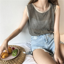 [言莎]2017新款 ulzzang夏季条纹圆领针织无袖小背心小衫女装上衣