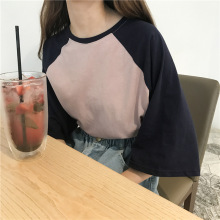 [言莎]2017新款 ulzzang韩版夏季撞色宽松圆领短袖T恤小衫女上衣