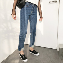 [言莎]韩国订单 韩版高腰宽松破洞毛边九分裤直筒裤牛仔裤休闲裤