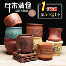 紫砂花盆宜兴精品高档盆景花盆圆形多肉花盆绿植盆栽花盆包邮托盘
