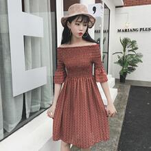 2017春夏新款韩版复古风一字领露肩褶皱碎花雪纺中袖连衣裙短裙女