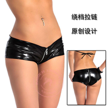 魅色时尚性感低腰显臀亮面黑色PVC乳胶氨拉链紧身女短裤GK07