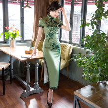 2017 春秋 立领修身短袖长款旗袍 丝绸高开衩民族风长款旗袍礼服