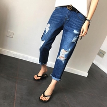 超薄超舒服 夏胖mm高腰宽松 bf女大码大破洞九分牛仔裤垮裤 显瘦