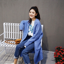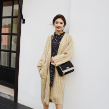 2017春新 韩国慵懒风糖果色宽松显瘦中长款棒针毛衣开衫女外套潮