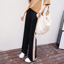 春季新款 韩版松紧腰高腰显瘦竖条拼色边西装料雪纺阔腿裤喇叭裤