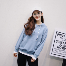 2017春装新品 韩版学院纯棉宽松袋鼠兜连帽假两件卫衣女套头上衣