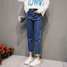 2017春新 韩系复古水洗纯色光板牛仔垮裤高腰宽松显瘦九分哈伦裤