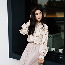 2017夏季新款韩系小清新木耳边袖子单口袋碎花雪纺衬衫女内搭上衣