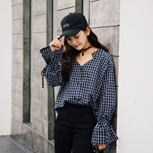 2017春季新款学院百搭小V领喇叭袖格子衬衫女宽松排扣衬衣潮上衣