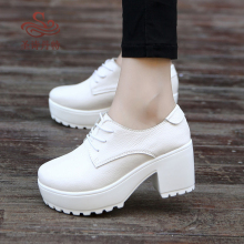 真皮高跟鞋厚底韩版粗跟防水台松糕鞋女系带圆头休闲增高黑色单鞋