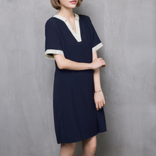 2017夏季新款女装韩版显瘦拼接撞色短袖V领宽松直筒雪纺连衣裙