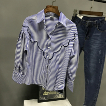 2017春新款韩版灯笼袖圆领条纹衬衫女宽松显瘦学生翻领刺绣衬衣
