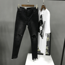欧洲站2017春款主打个性时尚破洞渔网牛仔裤女修身小脚铅笔裤显瘦