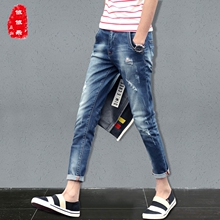 协协乐春季九分牛仔裤男青年小脚修身型韩版破洞哈伦裤9分裤子