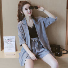2017春新款女装韩版翻领七分袖外套短裤棉麻两件套装 0330
