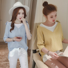 2017春夏新款女装韩版拼接五分袖假两件条纹衬衫衬衣 0427
