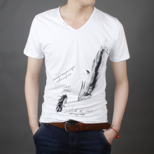 2017新款纯棉男士短袖t恤v领潮夏装男上衣修身纯白印花T恤男短袖