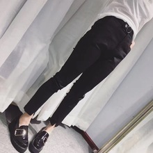 欧洲站新款裤脚开叉腰间圈圈纽扣修身纯色显瘦小脚裤打底裤女裤