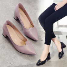 新款秋季单鞋欧美休闲尖头裸色方跟浅口性感工作单鞋女百搭潮