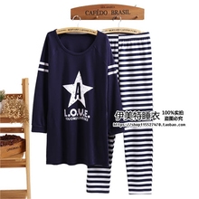 韩版睡衣女春秋季纯棉长袖条纹宽松加大码全棉家居服两件套装长款