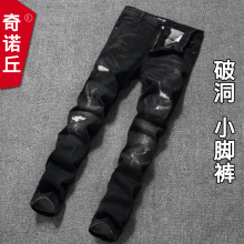 春季款男士韩版修身黑灰色破洞牛仔裤弹力显瘦小脚裤潮男装长裤子