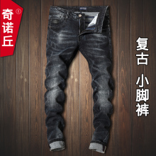 春季款男士牛仔裤修身弹力韩版小脚裤男做旧复古黑灰色潮男长裤子