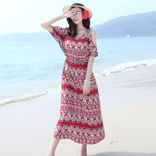 波西米亚松紧腰蝙蝠袖棉露肩民族海岛风格度假中长款印花连衣裙