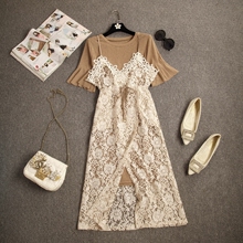 2017夏季新款小清新甜美中长款两件套套装裙蕾丝吊带裙短袖连衣裙