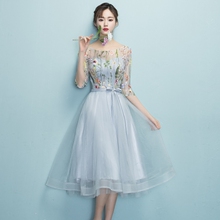 宴会晚礼服2017新款韩版优雅中袖灰色中长款伴娘礼服连衣裙女显瘦