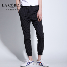 三弦 夏季黑色竖条纹裤子男休闲裤潮流长裤束脚裤修身小脚哈伦裤