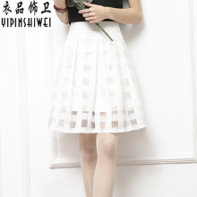 白色高腰格子欧根纱半身裙蓬蓬裙百褶裙短裙纱裙中裙A字裙女夏装