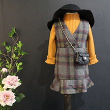 2016秋冬新款儿童连衣裙韩版女童V领格子加绒背心裙宝宝毛呢裙子