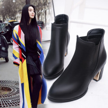 2016秋冬新款短靴高跟粗跟马丁靴尖头单靴松紧带女靴