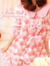 可爱娃娃领 蝴蝶结 冬季女款粉格法兰绒睡衣两件套家居服套装