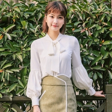 尤麦2017春季小立领灯笼袖复古休闲上衣白色蝴蝶结雪纺衬衫Y6633
