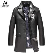 bekvan柔韧山羊皮可卸腰带中长款风衣男士休闲真皮皮衣[2657]