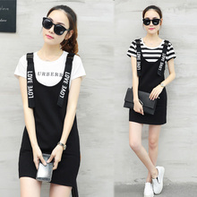韩版新款夏季条纹短袖时尚套装裙子中长款背带裙学生两件套连衣裙