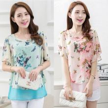 夏装新款女装韩范短袖雪纺衫 韩版显瘦百搭半袖印花雪纺上衣