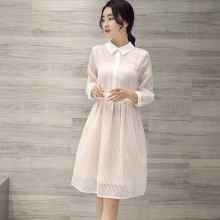 2017春季新款白色衬衫领欧根纱连衣裙女长袖中长款韩版气质裙子夏
