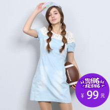 【2件198元】阿依莲2017欧洲站夏时尚学院拼接蕾丝牛仔短款连衣裙