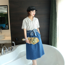 HH-13春装新款女时尚气质休闲条纹短袖衬衫半身牛仔裙套装两件套