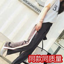 钱夫人CHINSTUDIO韩版系带开叉撞色条纹西装裤女宽松直筒裤阔腿裤