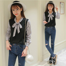 学生套头条纹针织衫夏天薄款宽松上衣女士七分袖T恤短款打底小衫