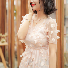 欧洲站夏款女2017新款显瘦网纱v领重工立体花朵连衣裙夏仙蓬蓬裙