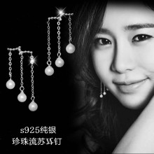 刘仁娜明星同款s925纯银耳钉长款流苏珍珠耳坠银饰耳环耳饰