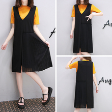 欧洲站2017春夏新款短袖中长款两件套裙 打底A字百褶雪纺连衣裙女