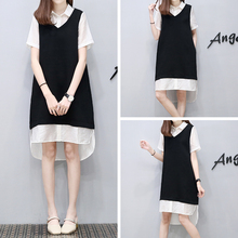 欧洲站2017夏季新款女装衬衫领短袖A字裙假两件中长款大码连衣裙