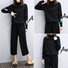 欧洲站2017春款宽松大码阔腿裤九分裤两件套刺绣卫衣时尚套装女潮