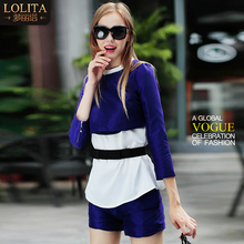 清仓68包邮撞色小立领假两件上衣+修身时尚短裤套